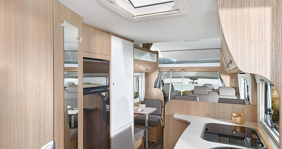 Viel, viel Platz im Alkoven: Grundriss für fünf Personen, jede Menge clevere Stauraumlösungen und eine hohe Garagenklappe.